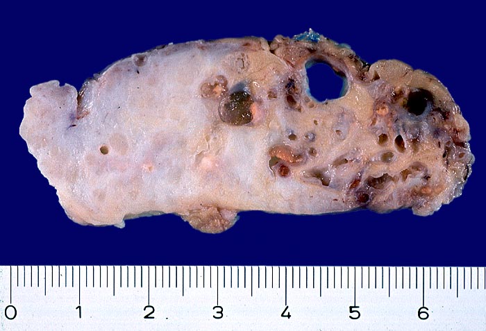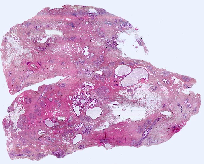 Ausgeprägte Fibrose und zystisch erweiterte Gangstrukturen in organoider Anordnung.