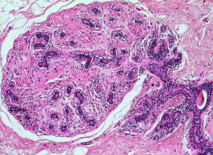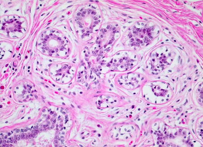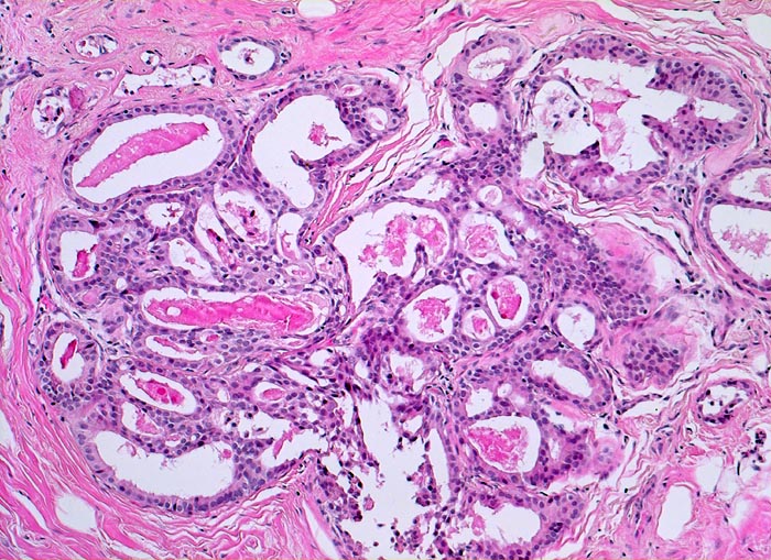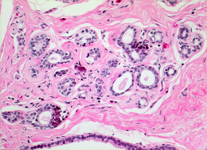 Makroskopisch bildet das mastopathisch veränderte Parenchym weisse kompakte fibröse Areale mit Einschluss von Zysten, welche oftmals eingedicktes Sekret enthalten. Neben einer Stromafibrose und zystisch ausgeweiteten Gängen mit Sekretretention findet sich oft eine unterschiedlich ausgeprägte intraduktale Proliferation von luminalen und basalen Epithelzellen. Nicht selten liegen als Begleitbefund kleine Fibroadenome, eine sklerosierende Adenose oder Gänge mit apokriner Metaplasie vor. Oftmals finden sich auch intraduktale Mikroverkalkungen. Die duktale Hyperplasie ist im Gegensatz zur atypischen Hyperplasie und zum Carcinoma in situ charakterisiert durch eine bunte, ungeordnete Proliferation ungleich grosser polygonaler bis spindeliger Zellen mit Ausbildung von schlitzförmigen Hohlräumen oder dünnen epithelialen Brücken. Die euchromatischen Kerne variieren in Grösse, Form und Lagerung. Bei paralleler Lagerung der Kerne entsteht der Eindruck eines Strömens und Fliessens der Zellen. Das duktale Carcinoma in situ ist von gutartigen intraduktalen Epithelproliferationen abzugrenzen aufgrund seiner Monomorphie ( 5185), Hyperchromasie der Zellkerne und starrer geometrischer Muster (runde scharf begrenzte wie ausgestanzte Lumina ( 5184), breite Brücken und Bögen, Mikropapillen). Eine intraduktale Epithelproliferation mit Atypie wird dann diagnostiziert, wenn nur ein Teil der Gänge oder Läppchen die typischen Veränderungen eines Carcinoma in situ zeigt. Die Abgrenzung der atypischen Hyperplasie von der Hyperplasie ohne Atypie erfolgt aufgrund qualitativer Merkmale und die Abgrenzung der Hyperplasie mit Atypie vom Carcinoma in situ aufgrund quantitativer Merkmale.