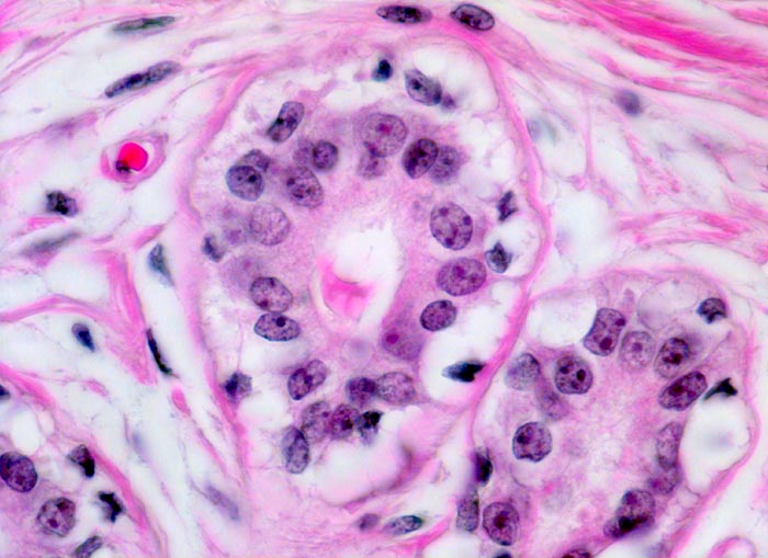 Alle Drüsen zeigen eine erhaltene äussere abgeflachte Myoepithelschicht mit hellem Zytoplasma.