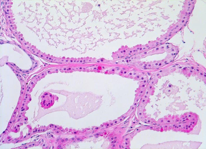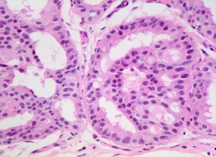 Herdförmig apokrine Metaplasie des Drüsenepithels: hochprismatische Zellen mit sehr reichlichem feingranulärem eosinophilem Zytoplasma und runden Kernen.