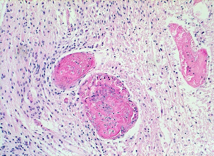 - Im Zentrum der Nekrose thrombosierte Gefässe umgeben von einem Saum vitaler Tumorzellen.