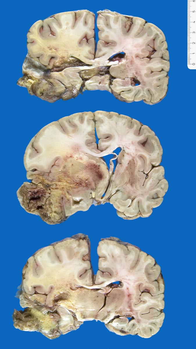 Die Schnittfläche ist auffallend bunt. Dies ist bedingt durch ein Nebeneinander von graurotem vitalem Tumorgewebe, gelben Nekrosen, roten Einblutungen und gelegentlich grünlichen Gallertzysten.