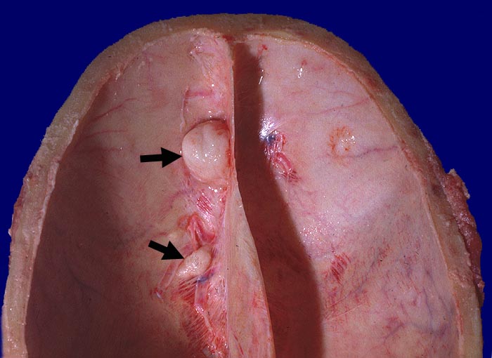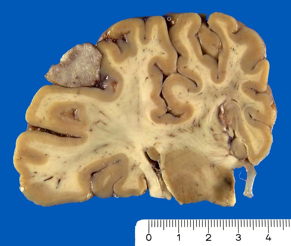 Der Dura breitbasig aufsitzender scharf begrenzter halbkugeliger Tumor.