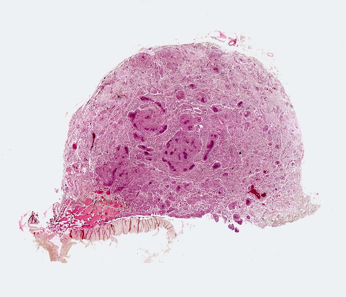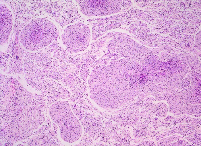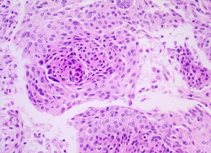 Kugelige Tumorzellverbände mit Ausbildung von typischen konzentrischen zwiebelschalenartigen Formationen und parallele Bündel spindeliger Zellen.