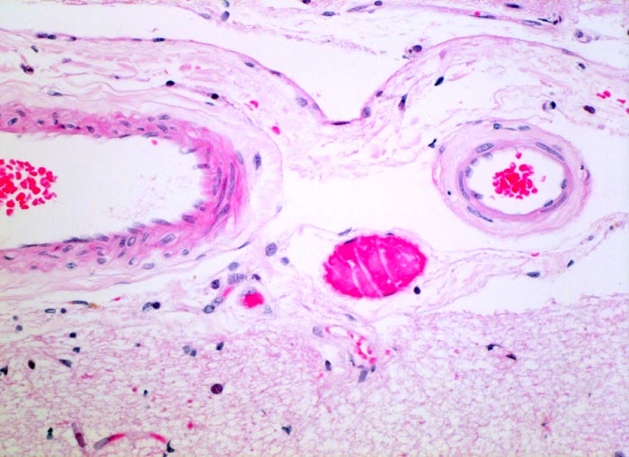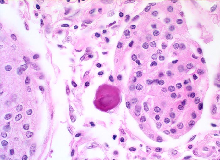 Das Meningeom zeigt ein grosses Spektrum histologischer Varianten mit sehr unterschiedlicher Morphologie. Am häufigsten sind meningotheliale (ihr Präparat), transitionale und fibroblastische Meningeome. Typisch für das meningotheliale Meningeom sind dicht gepackte Zellen mit unscharfen Zytoplasmagrenzen, Wirbelbildungen und Kerne mit intranukleären Vakuolen. Ferner finden sich konzentrische Verkalkungen in Form von Psammomkörperchen ( 255).