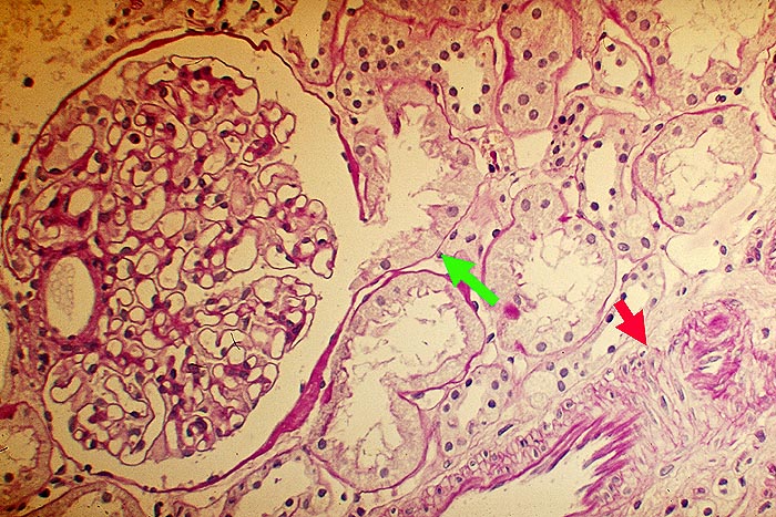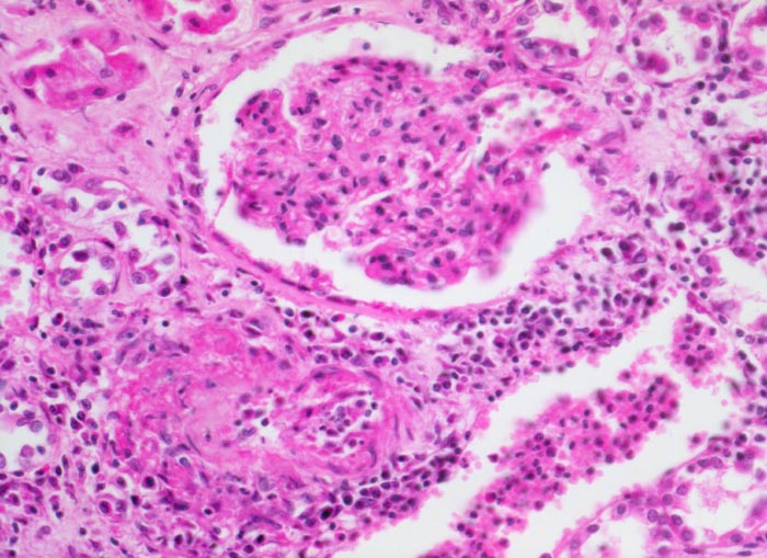 Befallen sind prärenale und grössere intrarenale Nierenarterienäste bei meist fehlender Beteiligung der Arteriolen und definitionsgemäss fehlendem Befall der glomerulären Kapillaren. Die betroffenen Gefässe zeigen segmentale transmurale oft durch Thrombosierung komplizierte Wandnekrosen mit initial granulozytenreichem Infiltrat. Im Verlauf werden die Nekrosen durch Granulations- und Narbengewebe organisiert. An grossen Arterien kann dies zu Knotenbildungen und Aneurysmata führen. Oft findet man in ein und demselben Gefäss frische Nekrosen neben reparativen Veränderungen und Narben. Das übrige Nierengewebe zeigt als Folge der Vaskulitis Kollapsglomerula, Infarkte und ischämische Tubulusatrophie mit begleitender interstitieller Fibrose und Entzündung.