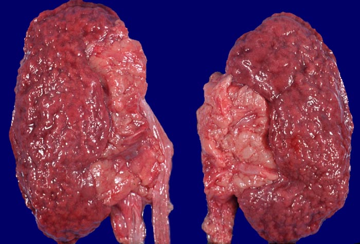 Der Nierenbefall ist Teilaspekt einer Systemkrankheit mit bevorzugtem Befall von Niere, Herz, Leber, Magen-Darmtrakt und Muskulatur.