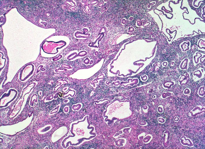 • Das Verhältnis von Stroma und Drüsen ist zu Gunsten der Drüsen verschoben (Drüsen:Stroma>1:1).