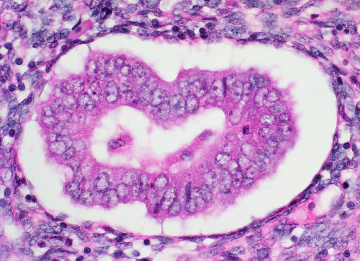 • Einige Drüsen werden von metaplastischem tubarem Epithel oder Flimmerepithel ausgekleidet. Das sollte der Kliniker dem Pathologen mitteilen:
