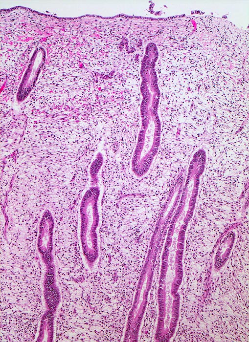 • Hyperplasie mit Atypie (AH)/Endometrioide intraepitheliale Neoplasie (EIN) Die hyperplastische Mukosa ist verdickt (2-3cm statt normal 0.2-1.2cm), homogen-weisslich glasig und weich. Die Drüsen sind verstärkt verzweigt, zystisch transformiert und ausgekleidet von mehrreihigem Epithel. Bei der Hyperplasie beträgt das Drüsen-Stroma Flächenverhältnis >1:1. Die Vorstufe der Hyperplasie mit gleichartigen architektonischen Veränderungen aber einem Drüsen-Stromaverhältnis <1:1 bezeichnet man als unregelmässig proliferiertes Endometrium. 1-3% der Frauen mit einer Hyperplasie des Endometriums ohne Atypie entwickeln im Verlauf ein gut differenziertes endometrioides Adenokarzinom. Das Risiko für die Entwicklung eines endometrioiden Adenokarzinoms ist dagegen viel höher bei Vorliegen einer Hyperplasie mit Atypie (> 1074) (> 1075) oder einer endometrioiden intraepithelialen Neoplasie (=Präneoplasie) (> 10369). Bei einem Viertel bis einem Drittel der Patientinnen mit solchen Läsionen in der Kurettage wird in der nachfolgenden Hysterektomie oder innerhalb eines Jahres die Diagnose eines endometroiden Adenokarzinoms gestellt. Das Karzinomrisiko ist 14x erhöht bei der atypischen Hyperplasie bis 45x bei der EIN. In Einzelfällen kann die Abgrenzung einer atypischen Hyperplasie oder einer EIN von einem Karzinom am Kurettagematerial sehr schwierig sein. Beim invasiven Karzinom sind die Drüsenarchitekturstörungen ausgeprägter und zwischen den Karzinomdrüsen fehlt das Stroma stellenweise vollständig.