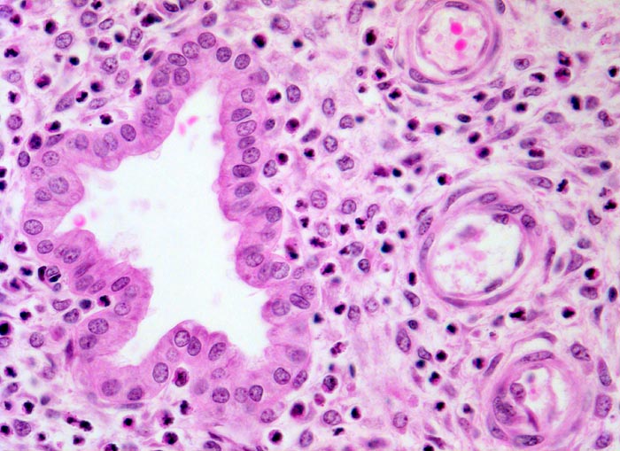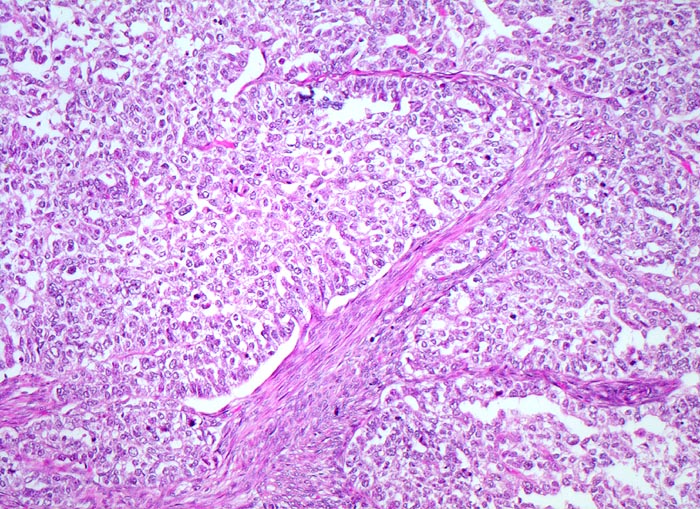 Histogenese: Karzinome im Bereich des Corpus uteri sind bis auf wenige Ausnahmen Adenokarzinome ausgehend von den Endometriumdrüsen. Der Begriff Endometriumkarzinom umfasst mehrere Entitäten, von denen das häufigste (80%) das endometrioide Adenokarzinom ist (Histokurspräparat), welches in den meisten Fällen östrogenabhängig ist. Die Präkanzerose der endometrioiden Endometriumkarzinome ist die atypische Hyperplasie. Nach der WHO-Klassifikation wird unterschieden zwischen einer Hyperplasie ohne Atypie mit einem Progressionsrisiko zum Karzinom von 1-3% und einer atypischen Hyperplasie bzw. einer endometrioiden intraepithelialen Neoplasie (EIN) mit einem Progressionsrisiko zum Karzinom von 25-30% innerhalb eines Jahres nach Kürettage (Langzeitrisiko bis zu 45x erhöht!). Endometrioide Adenokarzinome können auch von der Zervix, vom Ovar oder von der Tube ausgehen. Wenn ein endometrioides Karzinom gleichzeitig im Uterus und im Ovar vorliegt, kann deshalb nicht immer mit Sicherheit gesagt werden, ob es sich um zwei unabhängige Primärtumoren oder um ein metastasierendes Karzinom handelt.