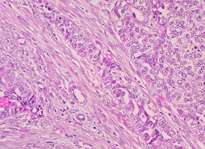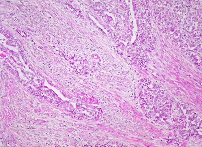Tumordrüsen ausgekleidet von mehrreihig angeordneten Tumorzellen mit hyperchromatischen polymorphen längsovalen Tumorzellkernen mit zahlreichen Mitosen. Die Morphologie der Tumordrüsen erinnert an proliferatives Endometrium.