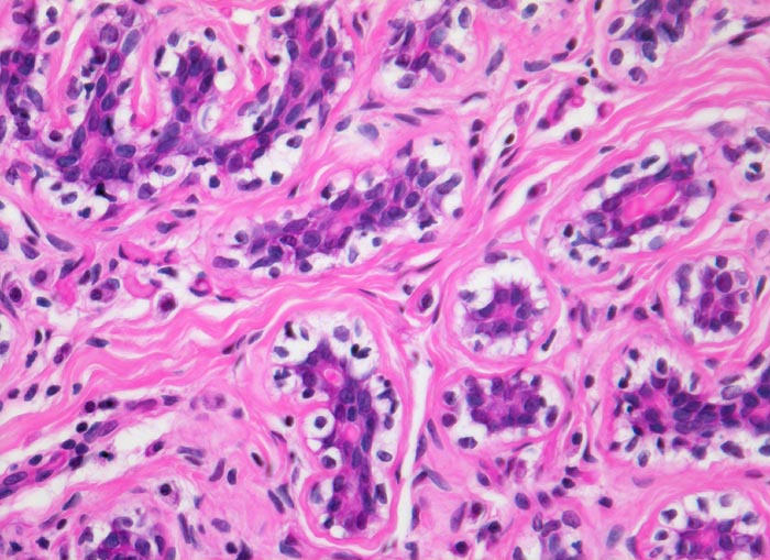 • Lobuläre Neoplasie (=nicht invasiver intralobulärer Karzinomanteil): Neben den zystisch erweiterten Drüsen finden sich Mammaläppchen, deren Azini teilweise leicht vergrössert sind durch Ansammlungen von atypischen Zellen mit vergrösserten Kernen und prominenten Nukleolen. Die Basalmembran der tumorbefallen Azini ist erhalten.