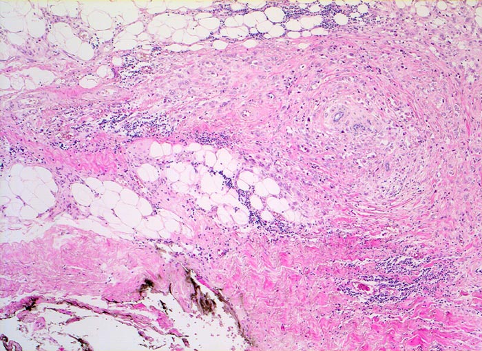 • Nich neoplastisches Mammaparenchym mit Fibrose, erweiterten Gängen ausgekleidet von metaplastischem apokrinem Epithel.