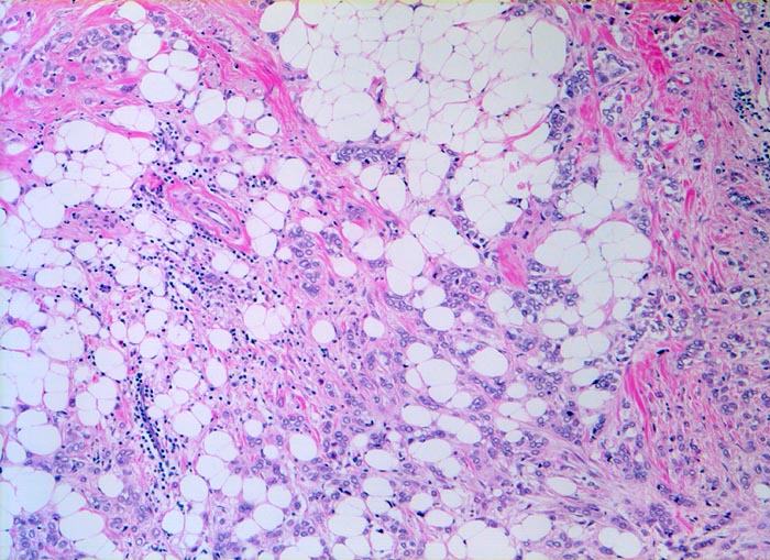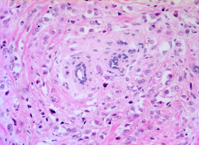 • Multifokale Infiltrate eines invasiv lobulären Mammakarzinoms: Kleine monomorphe, zytoplasmaarme Tumorzellen bilden einreihige Ketten (gänsemarschartig = Indian files) oder sind konzentrisch um nicht neoplastische Drüsen angeordnet.