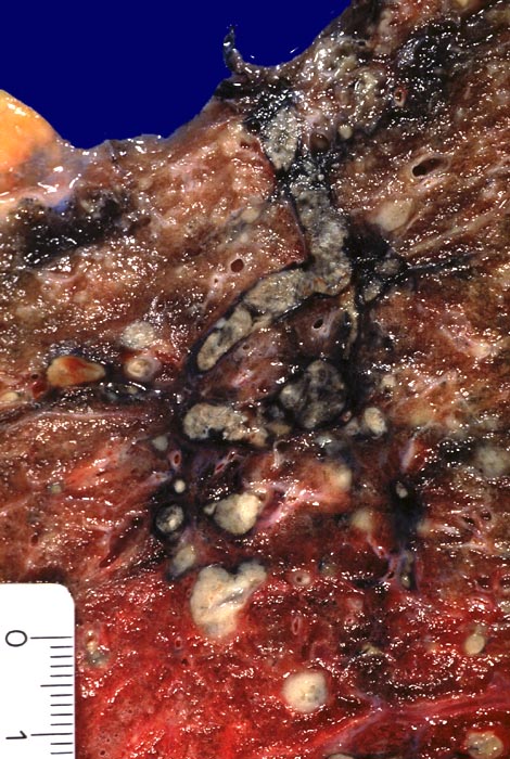 Tuberkulöse Herde ausgehend von vollständig oder partiell entzündlich zerstörten Bronchiolen in unmittelbarer Nachbarschaft von Arterien.