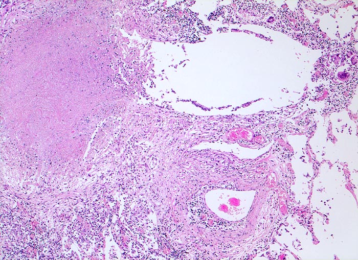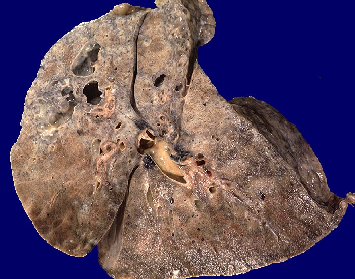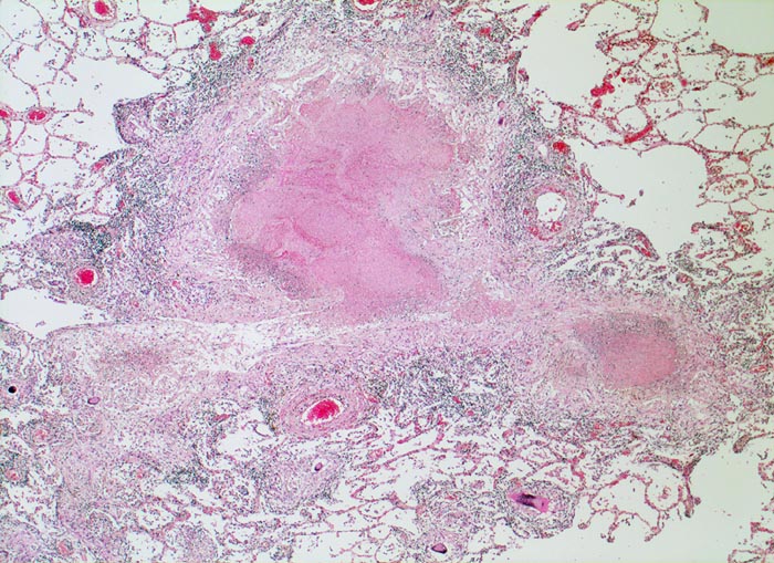 Das morphologische Bild ist äusserst variabel. Je nach Abwehrlage, Art und Geschwindigkeit der Ausbreitung entstehen unterschiedlich grosse, teils geschichtete Herde mit unterschiedlichem Grad an Epitheloidzellreaktion, zentraler Nekrose bzw. Vernarbung. Rein produktive Granulome ohne Nekrosen sind Zeichen guter Abwehrlage. Der Begriff Verkäsung bezieht sich auf den makroskopischen Aspekt von Nekrosen, der an Frischkäse erinnert. Exsudative nekrotisierende Granulome entstehen bevorzugt bei schlechter Abwehrlage. In späteren Stadien der Lungentuberkulose unterscheidet man produktive Phthisen mit azinös nodösen Gruppen von bronchogen entstandenen gering verkäsenden Streuherden (Präparat), zirrhotische Phthisen mit gering verkäsenden stark vernarbenden Herden und exsudative Phthisen bei schlechter Abwehrlage. Bei letzterer steht die Verkäsung im Vordergrund. Die bakterienreichen Herde entstehen teils hämatogen, teils bronchogen. Verkäsende Herde sind Ausgangspunkt für die Kavernenbildung. Kavernen stellen die wichtigste Quelle für die bronchogene Streuung dar.