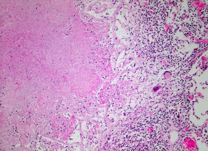 Granulome mit zentraler käsiger Nekrose mit Kerntrümmern umgeben von einem Epitheloidzellwall und einem äusseren blauen Saum von Lymphozyten.