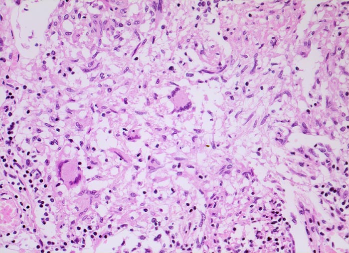 Schlanke spindelige Epitheloidzellen und einzelne Riesenzellen vom Langhanstyp mit peripher hufeisenförmig angeordneten Kernen.