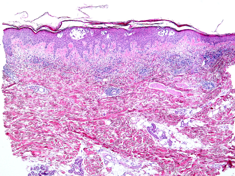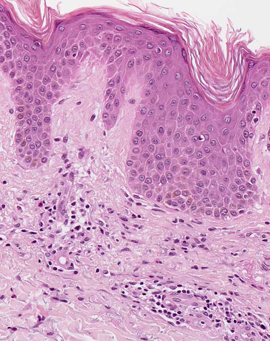 • Oberflächlich dermales perivaskulär betontes Entzündungsinfiltrat