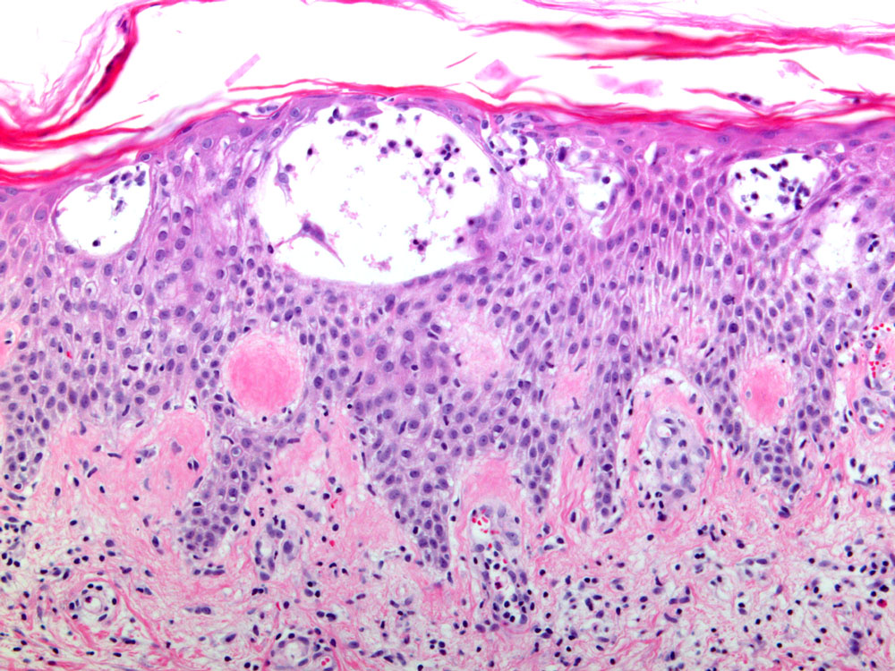 Entzündliche Hautreaktion mit Spongiose. Die Spongiose ist definiert als interzelluläres Ödem von Epidermis und/oder Adnexepithel, erkennbar an der Verbreiterung der Interzellularräume im Epithel. Bei gering ausgeprägter Spongiose stehen benachbarte Keratinozyten über verlängerte Interzellularbrücken noch miteinander in Kontakt, während bei stärkerer Ausprägung die desmosomalen Verbindungen dem Ödem nicht mehr standhalten und rupturieren, so dass sich die Zellen voneinander lösen und ein intraepitheliales Bläschen (spongiotisches Bläschen) entsteht. Dieser Prozess ist Ausdruck einer Entzündungsreaktion, die in der Regel durch Lymphozyten, seltener durch eosinophile oder neutrophile Granulozyten vermittelt wird. Die beteiligten Zellen sind im betroffenen Epithel (lymphozytäre Exozytose) und in der oberen Dermis nachweisbar. Verteilungsmuster und Zusammensetzung der Entzündungszellen können einen Hinweis geben auf die Ursache des spongiotischen Reaktionsmusters. Man unterscheidet klinisch und histopathologisch unterschiedliche Stadien (akut-subakut-chronisch).