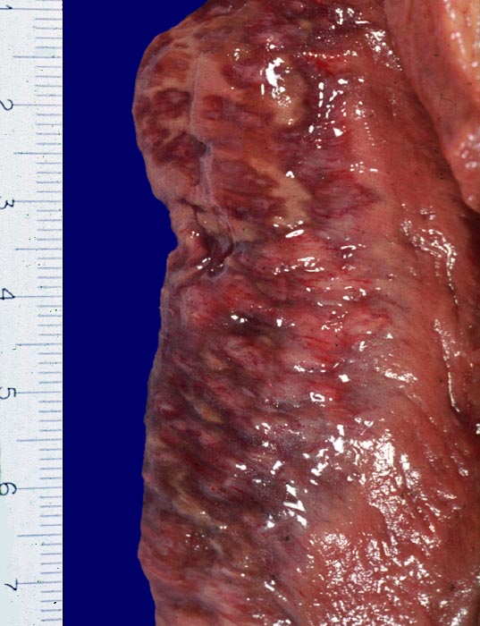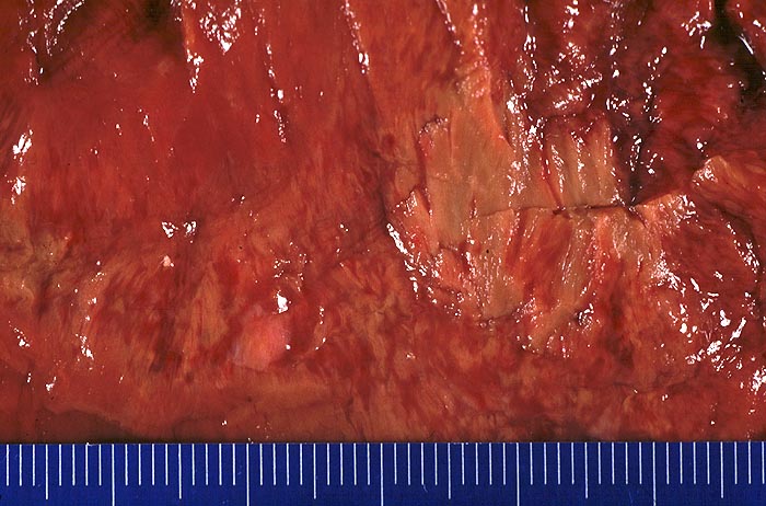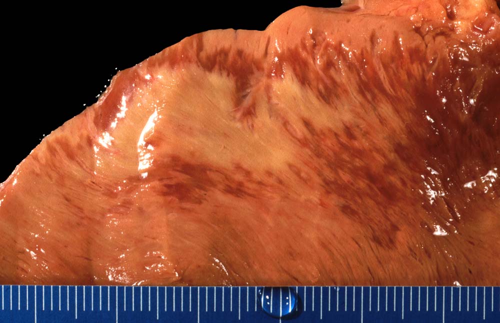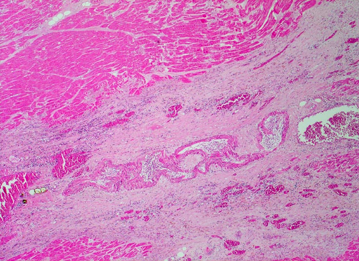 Von einem subakuten Myokardinfarkt spricht man, wenn der Infarkt ein Alter von mindestens 10 Tagen erreicht hat. Makroskopisch imponiert der subakute Infarkt als gelbe Nekrose mit peripherem rotem eingesunkenem Randsaum aus Granulationsgewebe von mindestens 1mm Breite. Da Infarkte von der Peripherie her organisiert werden, müsste ein 1cm dicker transmuraler Infarkt innert rund 50 Tagen vollständig organisiert und narbig umgewandelt sein. Nicht selten verbleiben jedoch noch nach mehreren Monaten nicht organisierte zentrale Infarktreste, weil die Organisation vom Subendokard her verzögert erfolgt und nur träge fortschreitet.