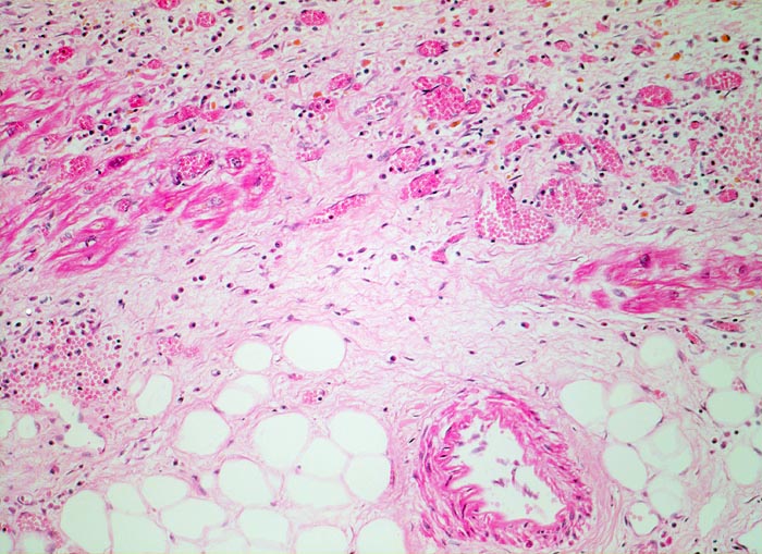 Vier Tage nach Infarktereignis beginnt vom Rand her die Einwanderung von Granulationsgewebe in das Infarktgebiet. Das Granulationsgewebe besteht aus Makrophagen, Lymphozyten, Plasmazellen, Kapillarsprossen und Fibroblasten. Der Granulationsgewebssaum vergrössert sich um rund 0.1mm pro Tag. Die Breite des Randsaums erlaubt deshalb eine Abschätzung des Infarktalters. In der zweiten Woche nach Infarkt lassen sich im Granulationsgewebe histologisch die ersten zarten Kollagenfasern nachweisen.