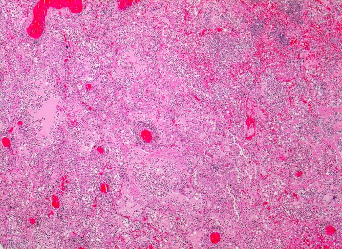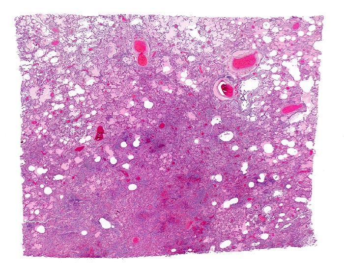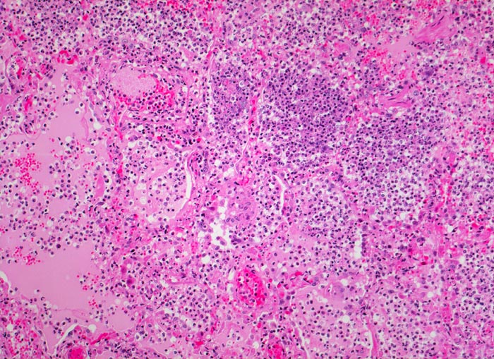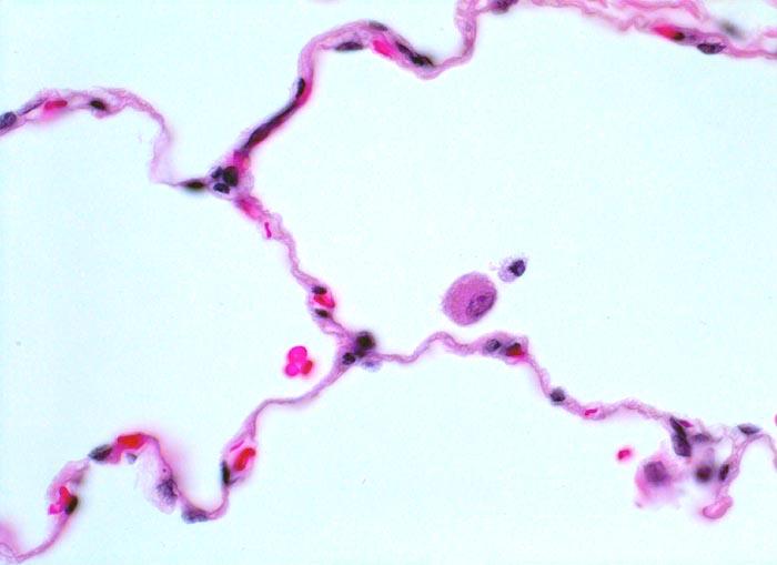 • Alveolen gefüllt mit hell-eosinophiler Ödemflüssigkeit oder neutrophilen Granulozyten, Erythrozyten und wenig Fibrin.