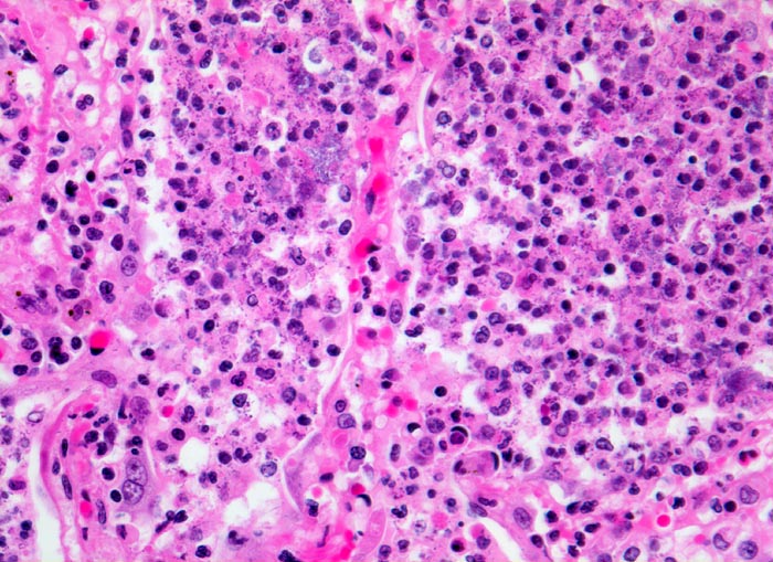• Haufen von blauen kokkoiden Bakterien in einigen Alveolen.