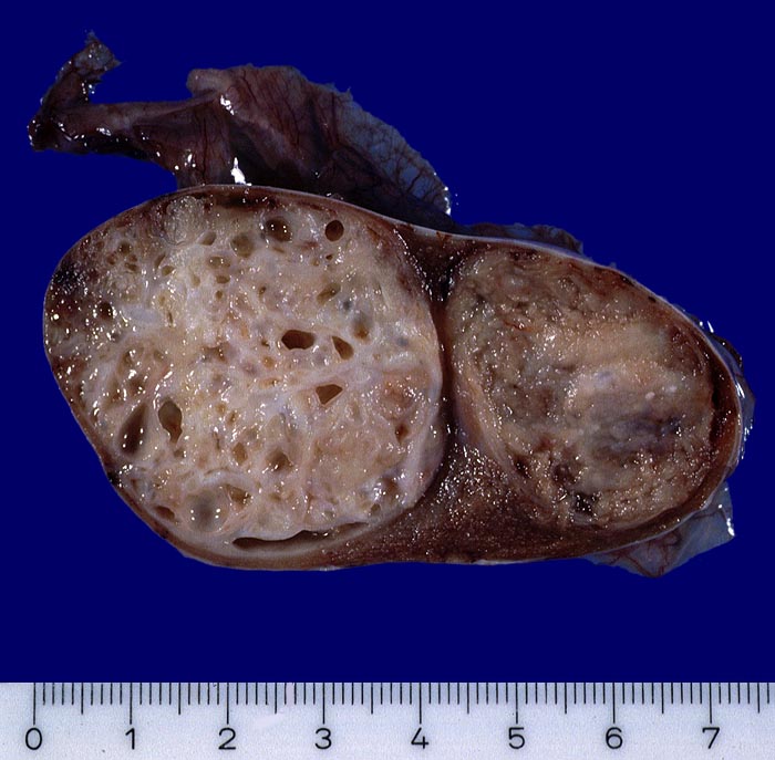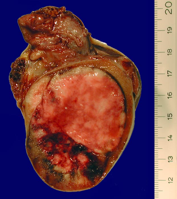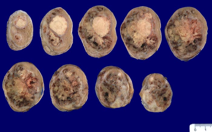Makroskopisch bilden die embryonalen Karzinome unscharf begrenzte, weiche, graubraune Tumorknoten mit Einblutungen und Nekrosen.