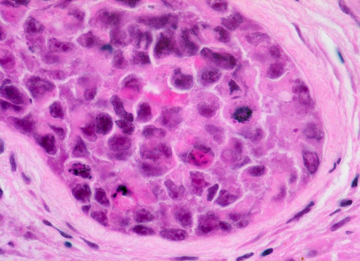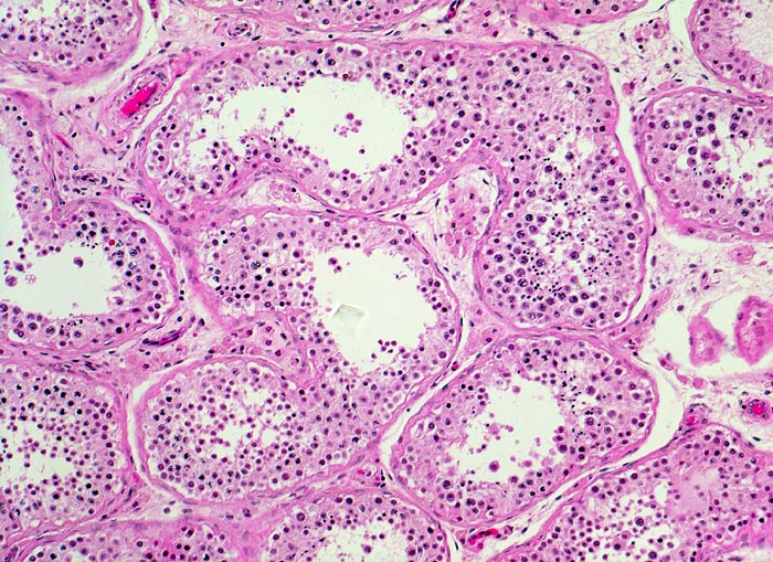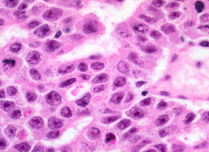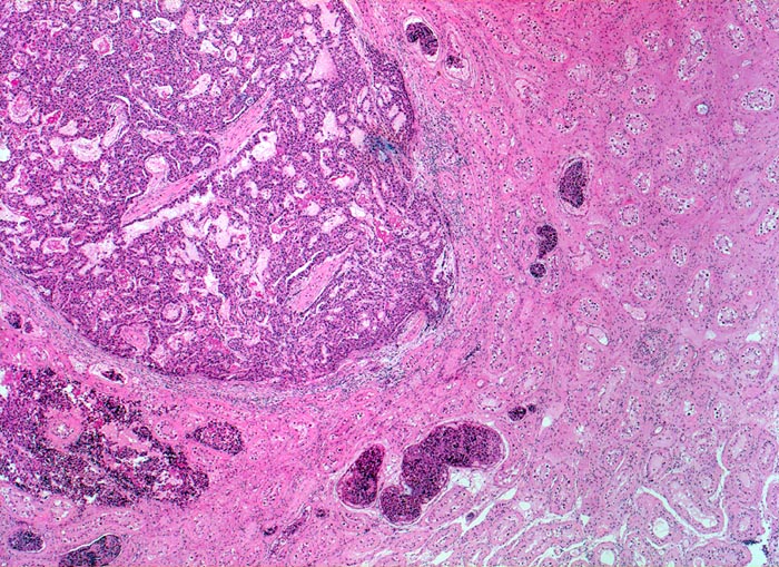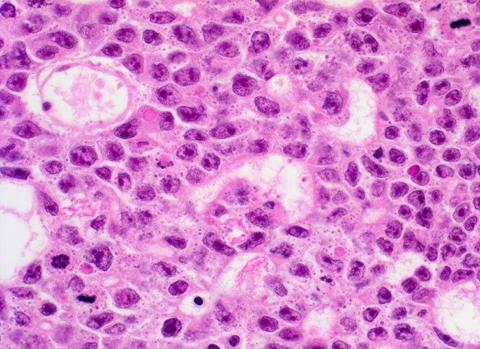 Histologisch bilden die Tumorzellen solide Zellplatten, Drüsen oder papilläre Strukturen mit Einblutungen und Nekrosen. Die Tumorzellen sind polygonal, kubisch oder zylindrisch, haben reichlich Zytoplasma und unscharfe Zellgrenzen. Die grossen Kerne haben grob verklumptes Chromatin und enthalten oft mehrere sehr grosse unregelmässige Nukleolen. Gefässeinbrüche und eine testikuläre intratubuläre Neoplasie sind in der Tumorumgebung häufig nachweisbar