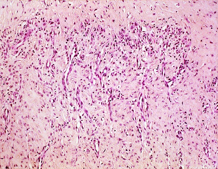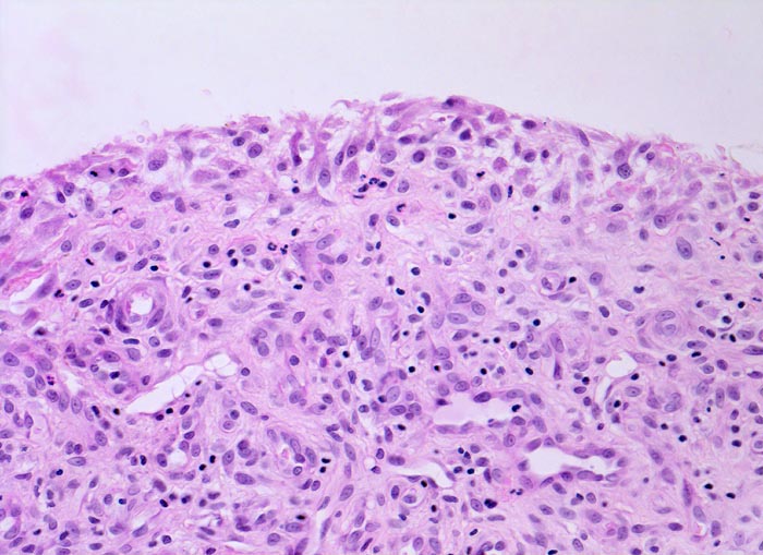 Als Folge frischer Schädigungen findet sich der inneren Oberfläche aufgelagertes Fibrin, das von Granulationsgewebe organisiert wird. Die operativ entfernten Bursen zeigen meist Veränderungen einer chronischen Bursopathie.