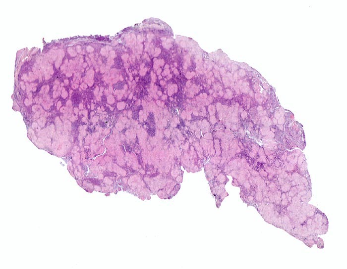 • Wenig erhaltenes Lymphknotengewebe (blau).