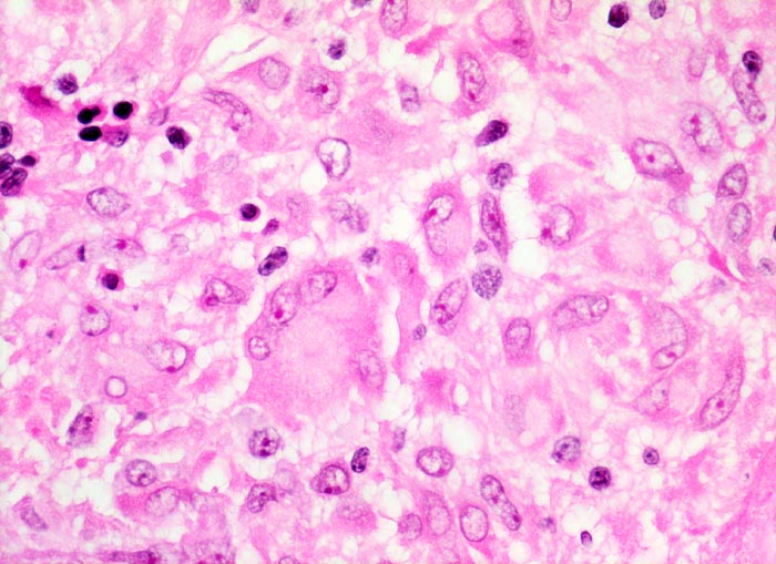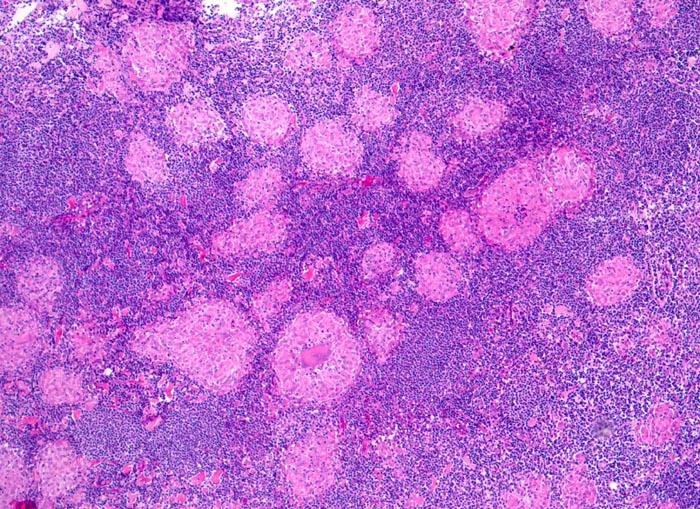 ·         Kleinherdige Epitheloidzellansammlungen ("sarcoid-like lesions") bei Toxoplasmose oder im Lymphabflussgebiet von zerfallenden Tumoren. Epitheloidzellgruppen findet man aber auch bei Seminomen (> 3072) und einigen malignen Lymphomen wie dem M. Hodgkin (epitheloidzellreiche Form des M. Hodgkin vom Mischtyp) oder bei manchen Non-Hodgkin-Lymphomen.
