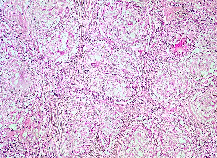 Sarkoidosegranulome bestehen aus Epitheloidzellen mit einem peripheren Lymphozytensaum. Mehrkernige Riesenzellen, meistens solche vom Langhans-Typ mit hufeisenförmig angeordneten Kernen und Asteroidkörperchen (> 4173) können zusätzlich vorhanden sein. Diese Granulome enthalten meist keine Nekroseherde (=produktives Granulom). Man findet diesen Granulomtyp hauptsächlich in Lymphknoten, aber auch in inneren Organen und in der Haut. Die Sarkoidosegranulome zeigen in späteren Stadien eine charakteristische perigranulomatöse und die Granulome septierend unterteilende Fibrose (> 4015).