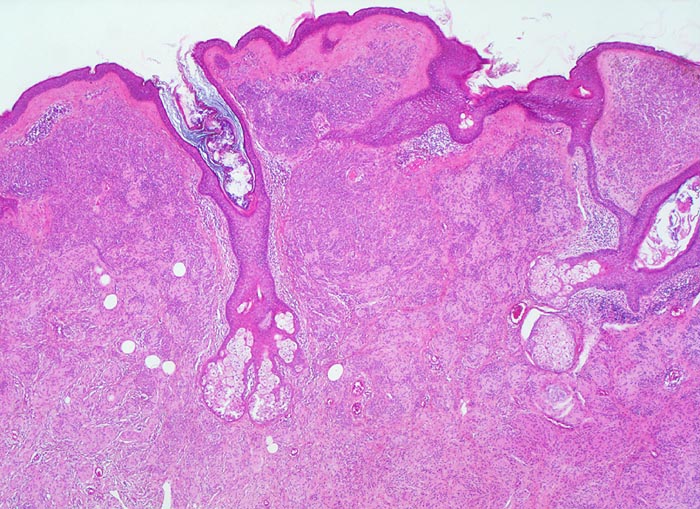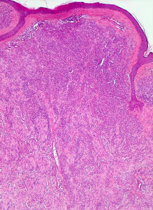 Kennzeichnend für einen gutartigen Naevuszellnaevus ist dessen Symmetrie und die Ausreifung der intradermalen Naevuszellen von oberflächlich gelegenen grossen, runden, pigmentierten Zellen in grossen Nestern, zu tiefer gelegenen kleineren, runden, nicht pigmentierten, in kleineren Nestern oder einzeln liegenden Zellen und in älteren Läsionen zu spindeligen Zellen mit neuralem Phänotyp mit Verlust der melanozytären Differenzierung (sogenannter Neuronaevus). Gewöhnliche Naevi zeigen keine zytologischen Atypien und die dermale mitotische Aktivität ist minimal.