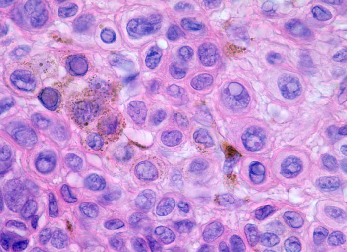 Oberflächliche Tumorzellen enthalten teilweise körniges braunes Melaninpigment.