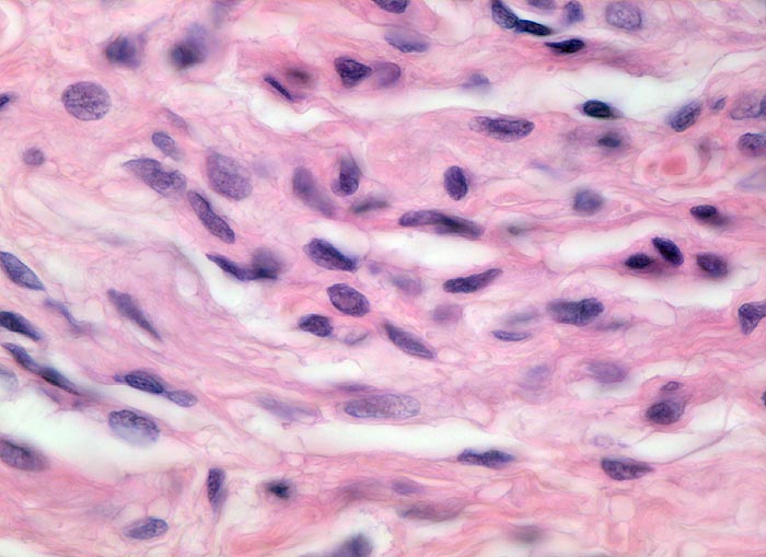 Die oberflächlichen Naevuszellen zeigen reichlich helles, teils pigmentiertes Zytoplasma und helle ovale Kerne mit kleinen, deutlich erkennbaren Nukleolen. Zur Tiefe hin werden die Naevuszellen kleiner, haben weniger Zytoplasma und dunkle kleine Kerne ohne gut erkennbaren Nucleolus. Die Zellnester werden zur Tiefe hin ebenfalls kleiner (=Ausreifung).