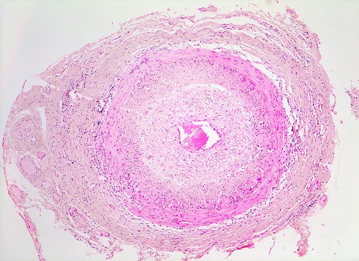 • Arteriensegment mit dichten, zirkulären lymphohistioplasmazellulären Entzündungsinfiltraten mit Beteiligung neutrophiler Granulozyten in allen Wandschichten (Adventitia, Media und Intima).
