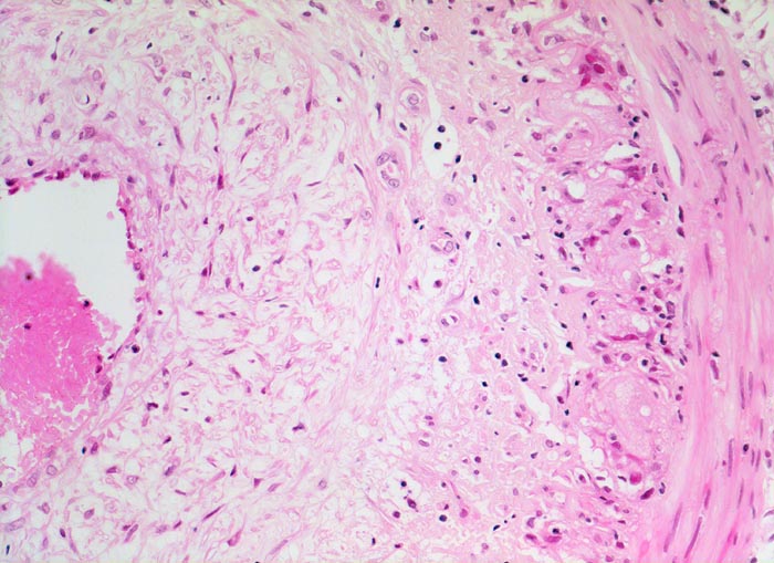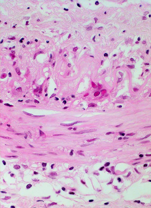 • Ausgeprägte Intimafibrose mit mit dichten Infiltraten zerfallender neutrophiler Granulozyten.
