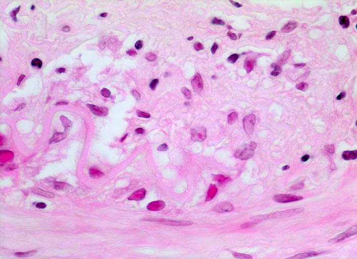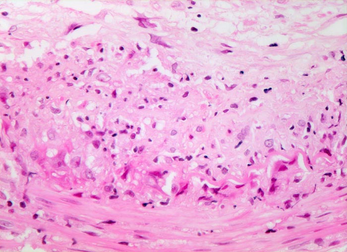 • Histiozyten und mehrkernige Riesenzellen finden sich bevorzugt entlang der Lamina elastica interna. Die Riesenzellen enthalten teilweise phagozytierte Fragmente der Lamina elastica interna.