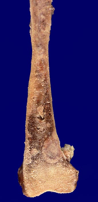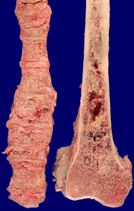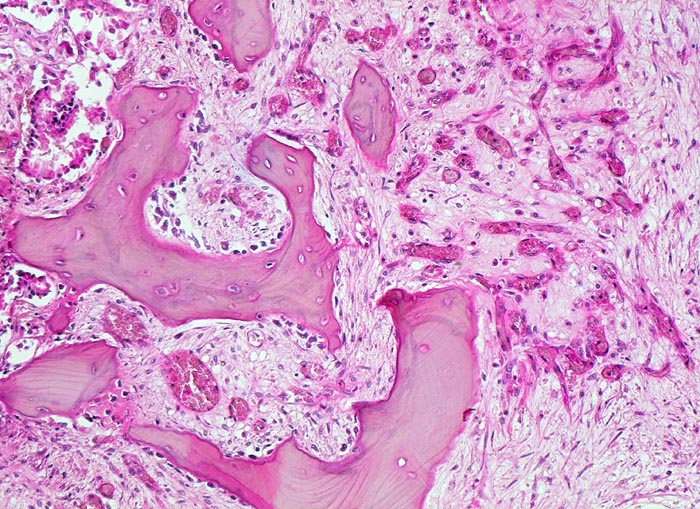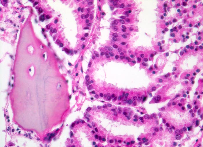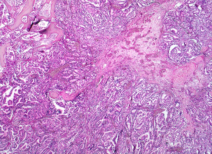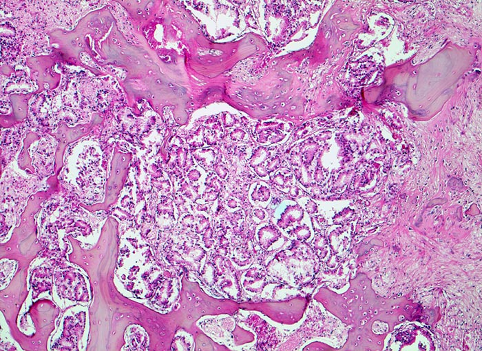 Da Adenokarzinome neben der Prostata in fast allen Organen vorkommenen, ist die Differentialdiagnose im HE Schnitt bei Nachweis einer Knochenmetastase eines Adenokarzinoms sehr breit. Die immunhistochemische Positivität der Tumorzellen für prostataspezifisches Antigen (PSA) spricht für eine Primärtumorherkunft aus der Prostata. Prostatakarzinome bilden typischerweise osteoplastische Knochenmetastasen. Die Knochenbildung erfolgt via Cytokine und Wachstumsfaktoren, die von den Tumorzellen gebildet werden (z.B. TGF-beta), durch Stimulation der Osteoblasten, wahrscheinlich bei gleichzeitiger lokaler Reduktion der Osteoklastenaktivität (RANK/RANKL/OPG-System). Die Stimulation von Osteoblasten führt zu einer vermehrten appositionellen Osteoidneubildung entlang vorhandener Trabekel mit nachfolgender Mineralisierung. Durch fortgeschrittene Knochenneubildung kommt es zu einer vollständigen Ummauerung grösserer Tumorareale, welche durch die verminderte Blutzufuhr nekrotisch werden. Vielfach lassen sich histologisch osteoplastische und osteolytische Anteile nachweisen. Immunhistochemisch lässt sich in den Metastasen oft Prostata spezifisches Antigen nachweisen ( 5342).