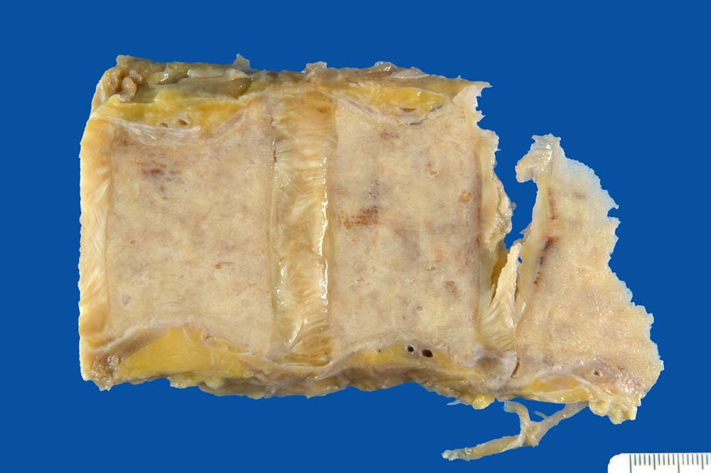 Anhand der Histologie kann lediglich die Diagnose einer Metastase eines Adenokarzinoms gestellt werden. Kleine, solide Verbände bildende Tumordrüsen und grosse Nukleolen sind typisch für ein Prostatakarzinom. Die Diagnose muss aber durch den Vergleich mit der Morphologie des Primärtumors oder eine Immunhistochemische Untersuchung (PSA, PSAP) bestätigt werden.