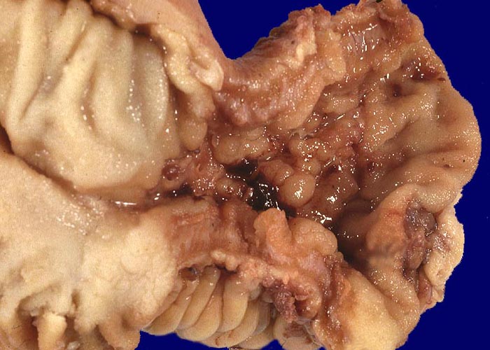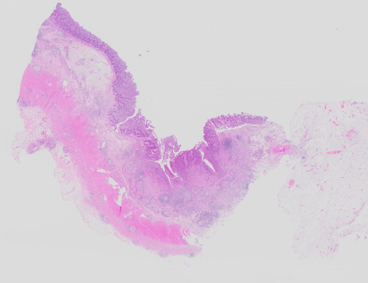 Befunde in der Mukosa wie epitheloidzellige Granulome, aphthöse Ulzera und Erosionen und fokal aktive Entzündung sind nicht spezifisch für den Morbus Crohn. Jene histologischen Aspekte, welche die Erkrankung am besten charakterisieren, sind in der Darmwand gelegen und lassen sich an einer endoskopisch gewonnenen Biopsie nicht nachweisen (fissurale, spaltförmige Ulzera, submukosales Ödem mit Lymphangiektasien, submukosale Fibrose, transmurale Entzündung mit lymphoidzelligen Aggregaten, neuromuskuläre Hypertrophie mit Wandverdickung (> 364), subseröse und submuköse Granulome (> 1133)).