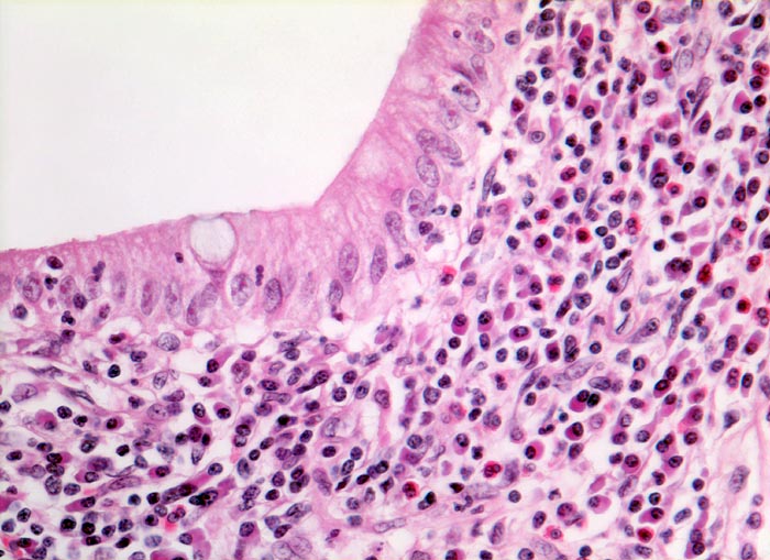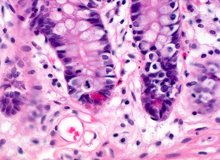 Neutrophile Granulozyten in der Lamina propria (aktive Entzündung) und Gewebseosinophilie (vermehrte eosinophile Granulozyten in der Lamina propria).