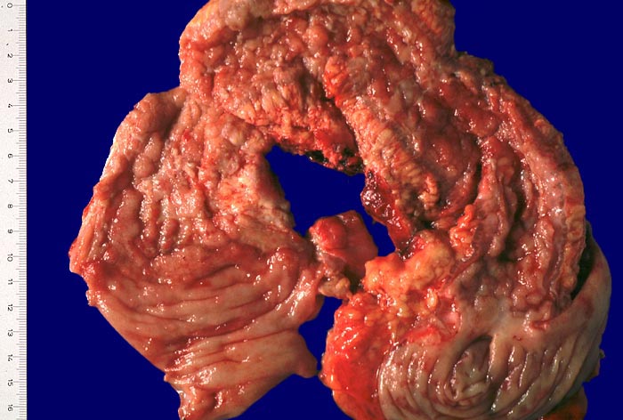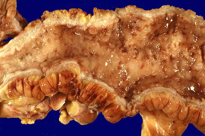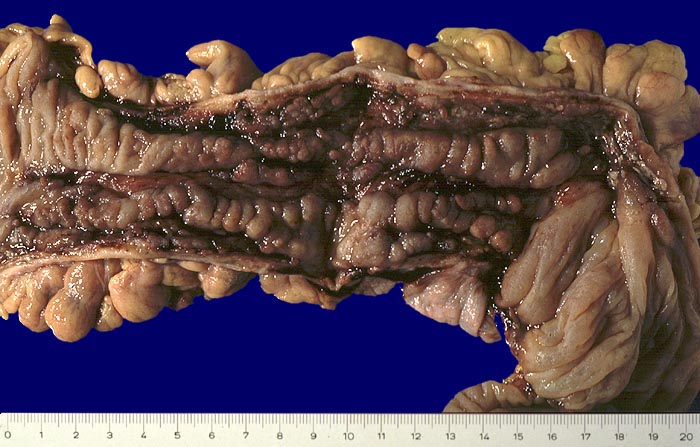 Die Verteilung der Läsionen im Darm ist sowohl makrokopisch (> 2884) als auch mikroskopisch (> 656) (> 409) diskontinuierlich und herdförmig ausgeprägt. Im Gegensatz zur Colitis ulcerosa können beim Morbus Crohn nicht nur das Kolon, sondern sämtliche Abschnitte des Gastrointestinaltraktes befallen sein. Am häufigsten ist das terminale Ileum zusammen mit dem Kolon befallen.