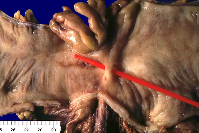 • Schlitzförmige fissurale Ulzera mit Vernarbung der umgebenden Submukosa.