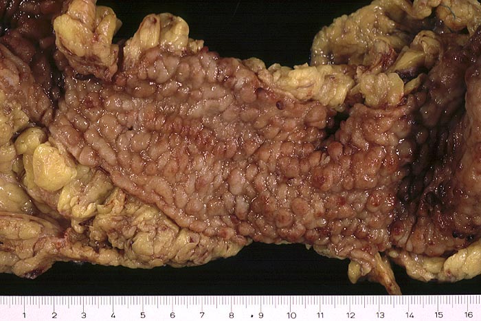 Makroskopisch typisch sind oberflächliche aphthöse Ulzera, gartenschlauchartige Strikturen im Dünn- und Dickdarm mit segmental verdickter und fibrosierter Darmwand, intramurale Abszesse, entzündliche Konglomerattumoren und verbackene Darmschlingen mit Fistelbildungen. Häufiger im Dünndarm als im Dickdarm findet sich das klassiche Pflastersteinrelief der Schleimhaut aufgrund rissförmiger Ulzera zwischen ödematösen Schleimhautarealen (> 369) Granulationsgewebspolypen oder Pseudopolypen (erhaltene Schleimhautinseln in Ulkusarealen) (> 408) finden sich beim Crohn seltener als bei der Colitis ulcerosa.