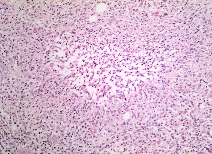• Zahlreiche epitheloid-riesenzellige Granulome in allen Wandschichten.