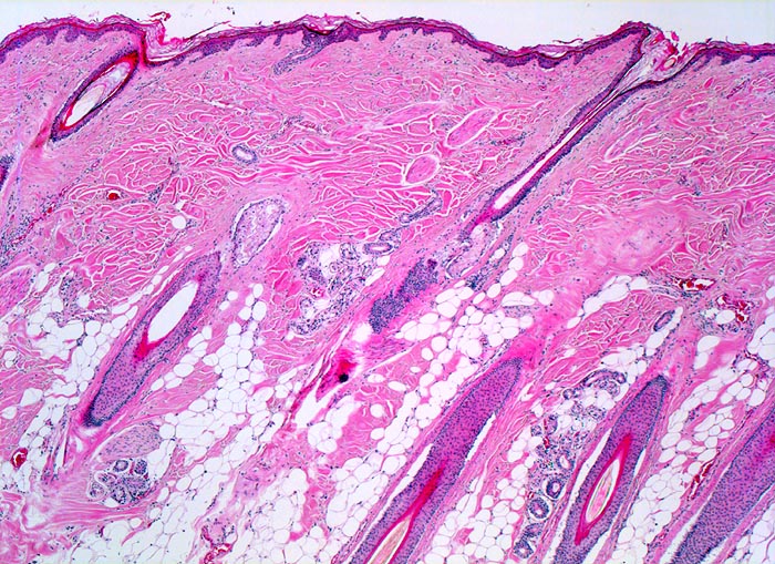 • Die Dermis in der tumorfreien Haut zeigt eine deutliche solare Elastose als Zeichen der chronischen UV Schädigung.